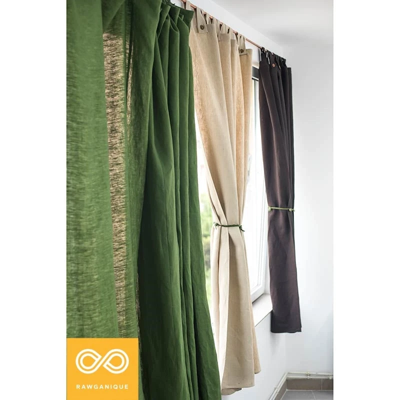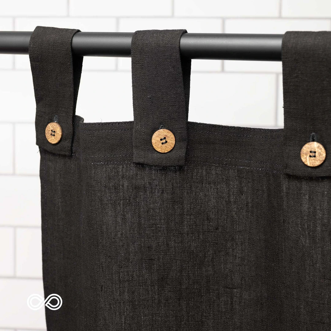 Eco friendly organic hemp curtain with tabbed button closure.