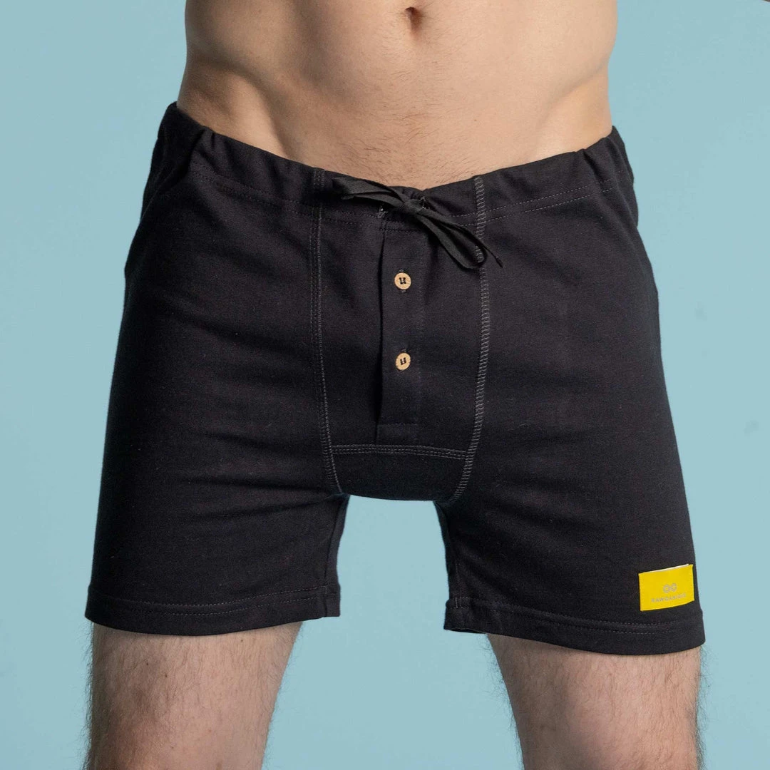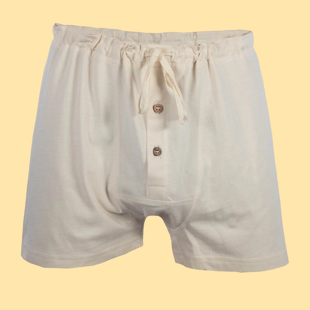 Style: Elastic-free organic cotton knit drawstring boxers with buttoned fly