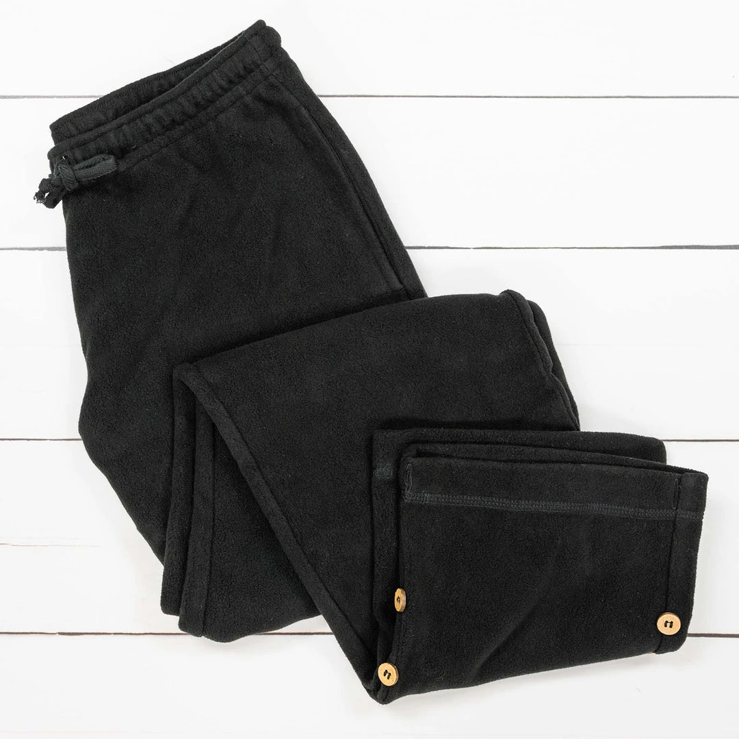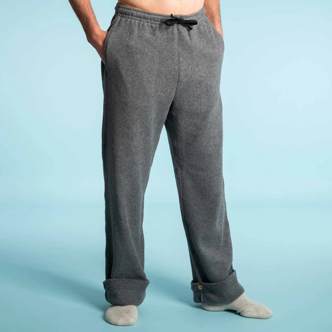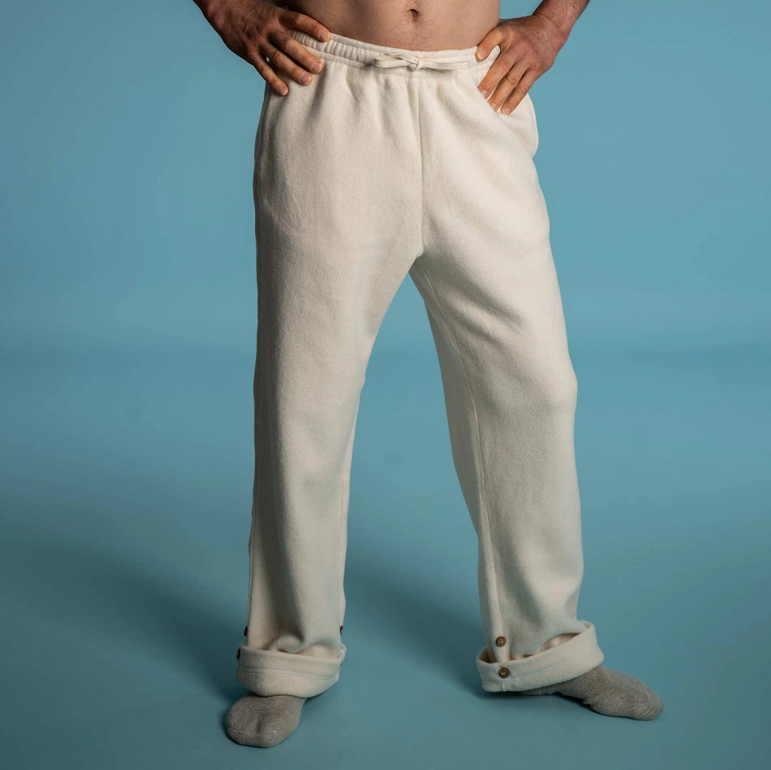One of our most popular products since 1997. Plastic-free 100% organic cotton fleece sweat pants made from our famed organic cotton fleece that’s brushed on both sides for ultra softness and warmth. Covered elastic waistband with organic cotton drawstrings. Roomier, relaxed cut, featuring coconut buttons for adjusting the inseam to desired length (pants are cut long to accommodate people who need long inseams). Men’s sizes S – XXL. (Many female customers like this cut but we also make women’s fleece sweatpants called Jolene.) Best to wash separately from other garments as untreated organic cotton fleece will lint for a few washes. Lay flat or hang to dry. Did you know that most fleeces on the market are made of plastic and that each laundry load of synthetic clothing sheds up to 6 million pieces of micro plastics that find their way into the ocean and soil? Our 100% organic cotton fleece is soft, safe, and biodegradable so won’t harm the soil or the ocean ecosystem.