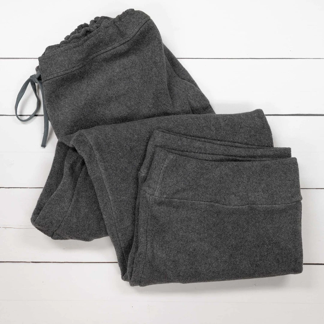 Elastic-free, plastic-free 100% organic cotton fleece sweat pants, brushed on both sides for ultra softness and warmth. Unisex XS – 3XL. Did you know that most fleeces on the market are made of plastic and that each laundry load of synthetic clothing sheds up to 6 million pieces of micro plastics that find their way into the ocean and soil? Our 100% organic cotton fleece is soft, safe, and biodegradable so won’t harm the soil or the ocean ecosystem. Wash on gentle cycle; lay flat to dry. Many customers fluff them up by tumbling on low heat after it has been dried on the rack.