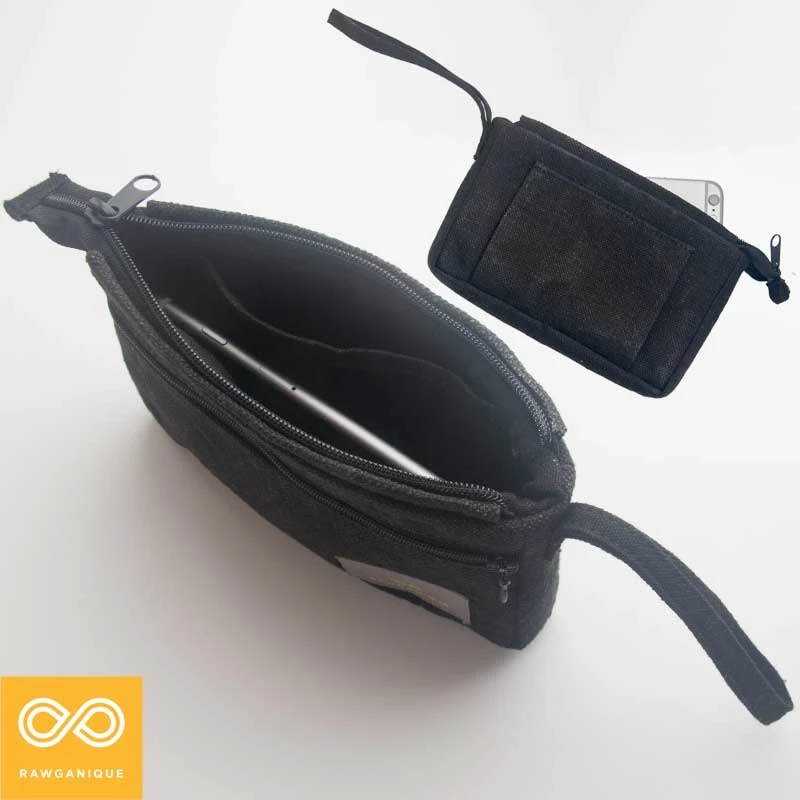 100% organic hemp wrist iDevice pouch, hand-crafted from unwashed stiff hemp canvas for durability. 7.25″ x 4.75″ x 1″. For passport, wallet, change, EarPods, phones…