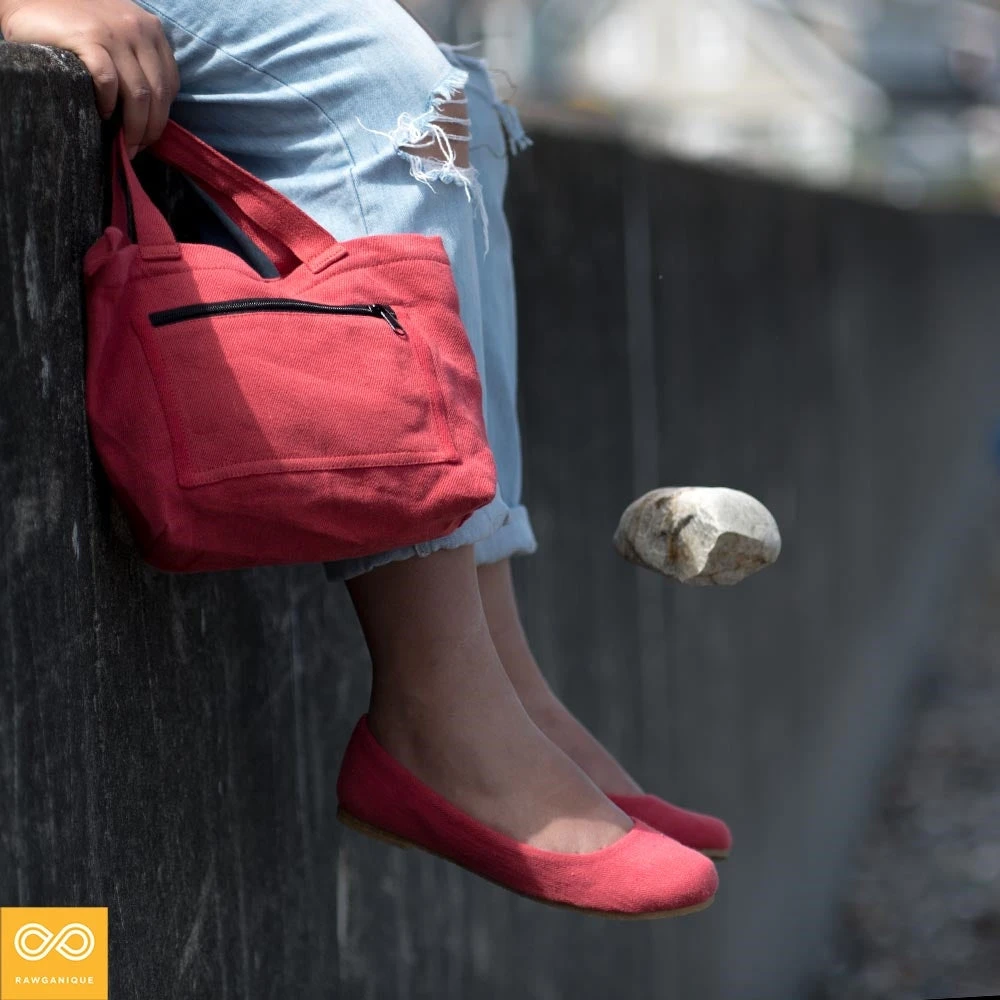 Handmade organic hemp ballet flat / Mary Janes, featuring hand-cut natural rubber soles. Sizes 5 (36) – 10 (41). Red, Teal, Natural, Beachstone, Black. Use our 100% natural wax to waterproof and stain-proof.