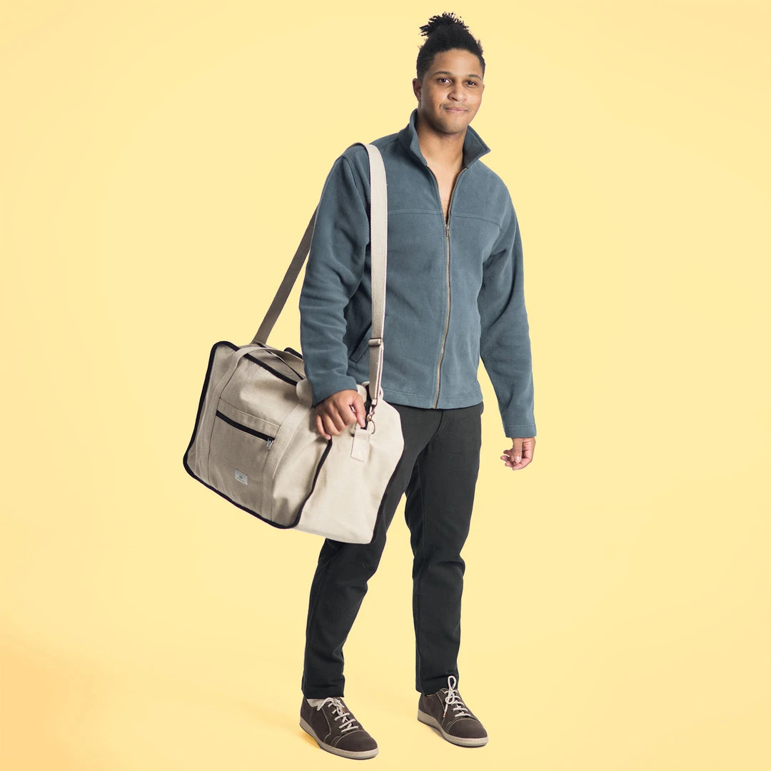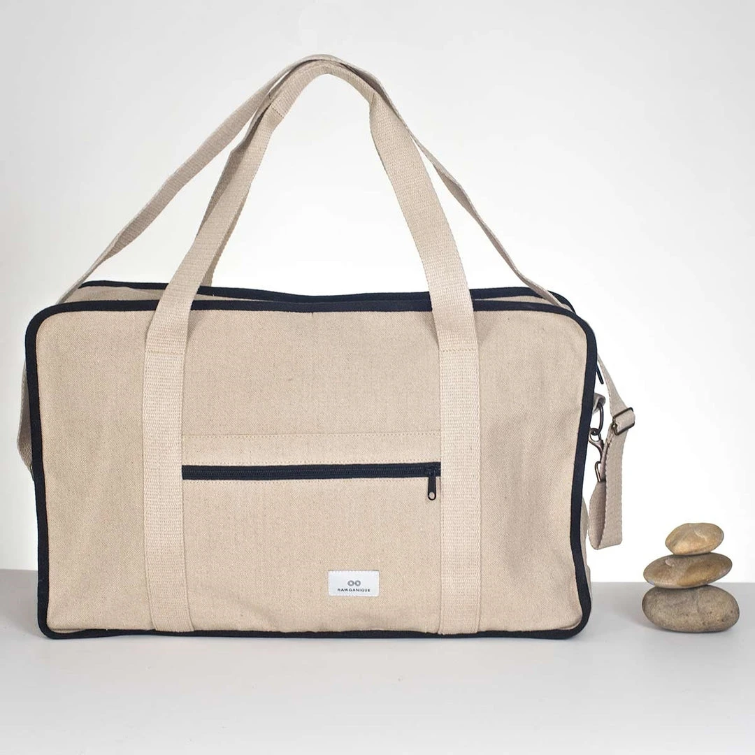 Looking for vegan organic hemp carry-on luggage? Max out on the carry-on allowance with our 100% organic hemp carry-long luggage that can be carried on the shoulder with the handle or strap. This hemp luggage fits a TON of stuff because there is no wasted space for wheels & handles. There is a handy zippered front pocket to keep your passport, itinerary, wallet, watch, etc handy while going through the check-in counter & security checks. Go for a weekend or a week or a month anywhere your heart desires with our leather-free, zero-waste, plastic-free organic hemp carry-on luggage in tow. Bon voyage!