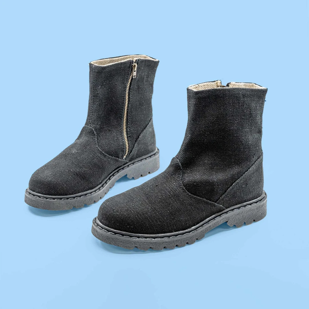 Handmade organic hemp boots with zipper, in ladies’ sizes. Breathable. Waterproof using our 100% natural wax; it takes just minutes to do.
