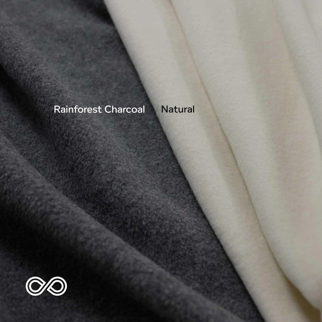 Unique & rare 100% organic cotton fleece, brushed on both sides for ultras softness and warmth. 320GSM. Sold by the yard. Natural unbleached & undyed: 72″ wide. Rainforest Charcoal: ~58″ wide. The charcoal is a special blend of different blacks, grays and natural to create a color with great depth and interest. Eco dye.