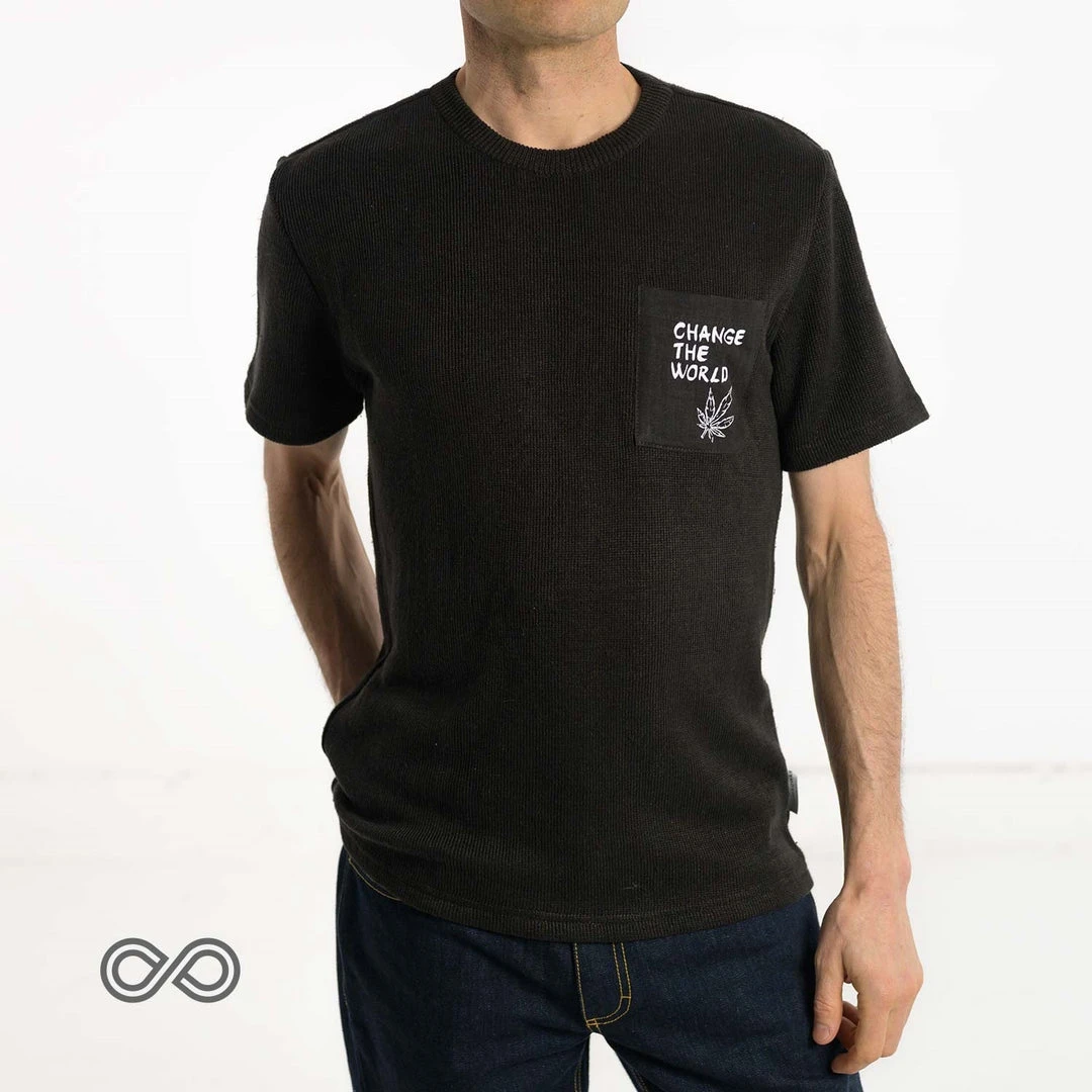 Cut like our ever-popular Bel Air 100% organic hemp T-shirt, this thicker-weight ribbed knit organic hemp T-shirt offers a more durable T-shirt for those wanting a cozier year-round T-shirt experience. Not only is this super breathable 100% hemp T-shirt completely chemical-free, it is also free of plastic so you don’t have to worry about sweats, arm-pit smells, and rashes caused by conventional nylon clothing. Choose from four of our classic print designs on the pocket of the shirt offered in Natural and Black.