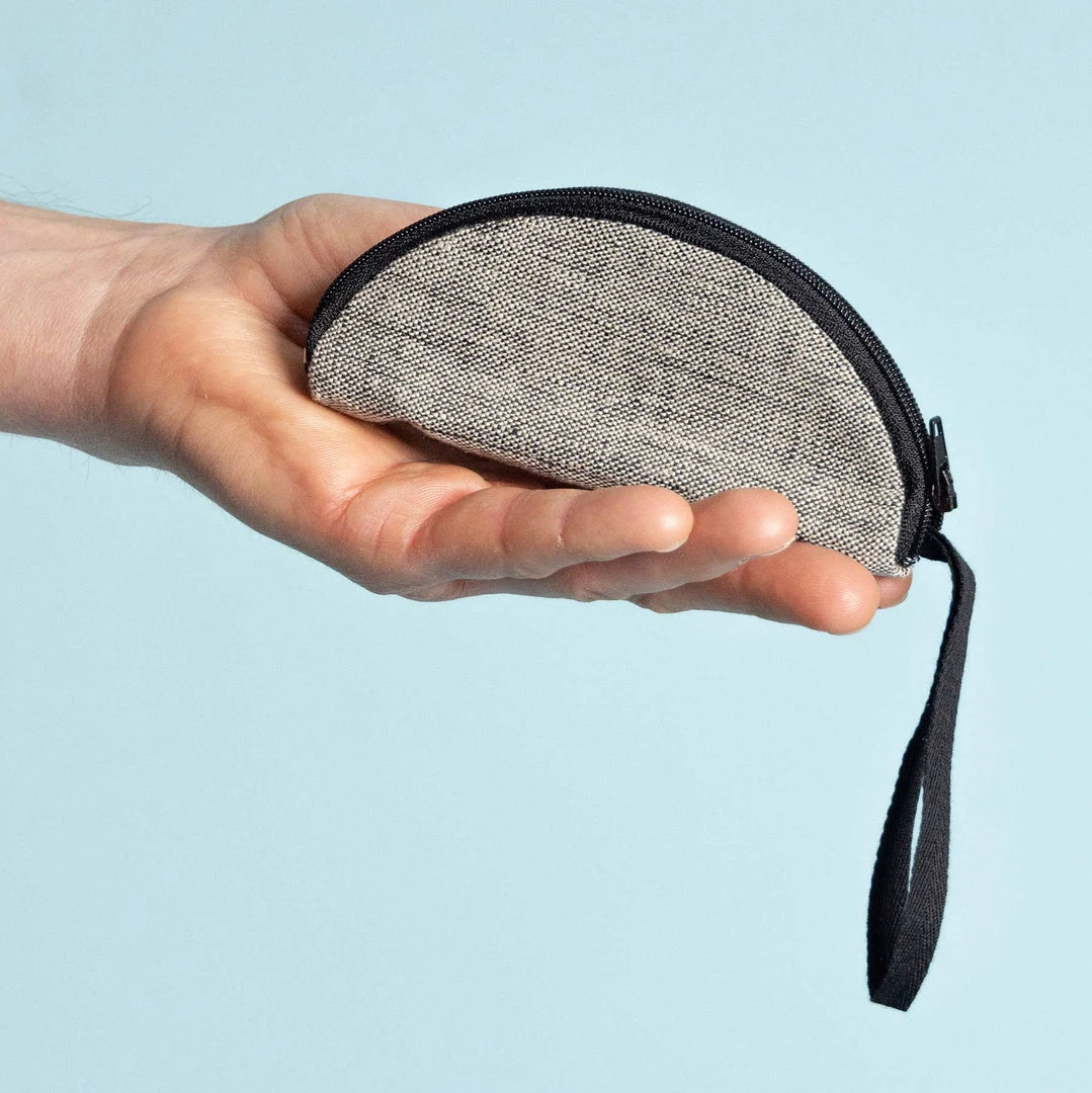 Plastic-free 100% organic hemp key holder. Zippered half-moon change wallet – great for holdings keys, fobs, USB sticks, memory cards, and even credit crds (snug fit). Sweatshop-free.