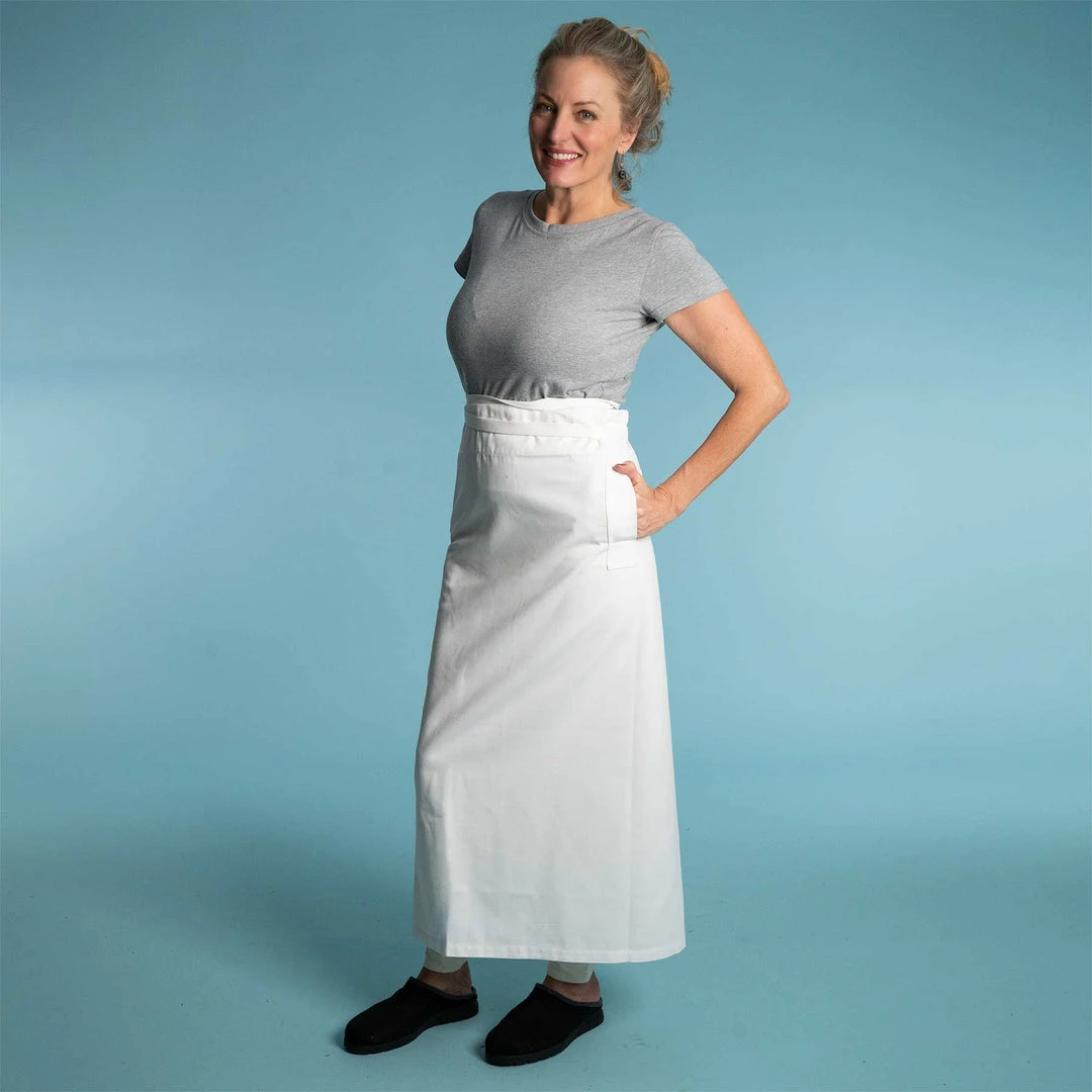 Professional organic cotton, linen, or hemp bistro apron — from the waist down. Sweatshop-free. Chemical-free.