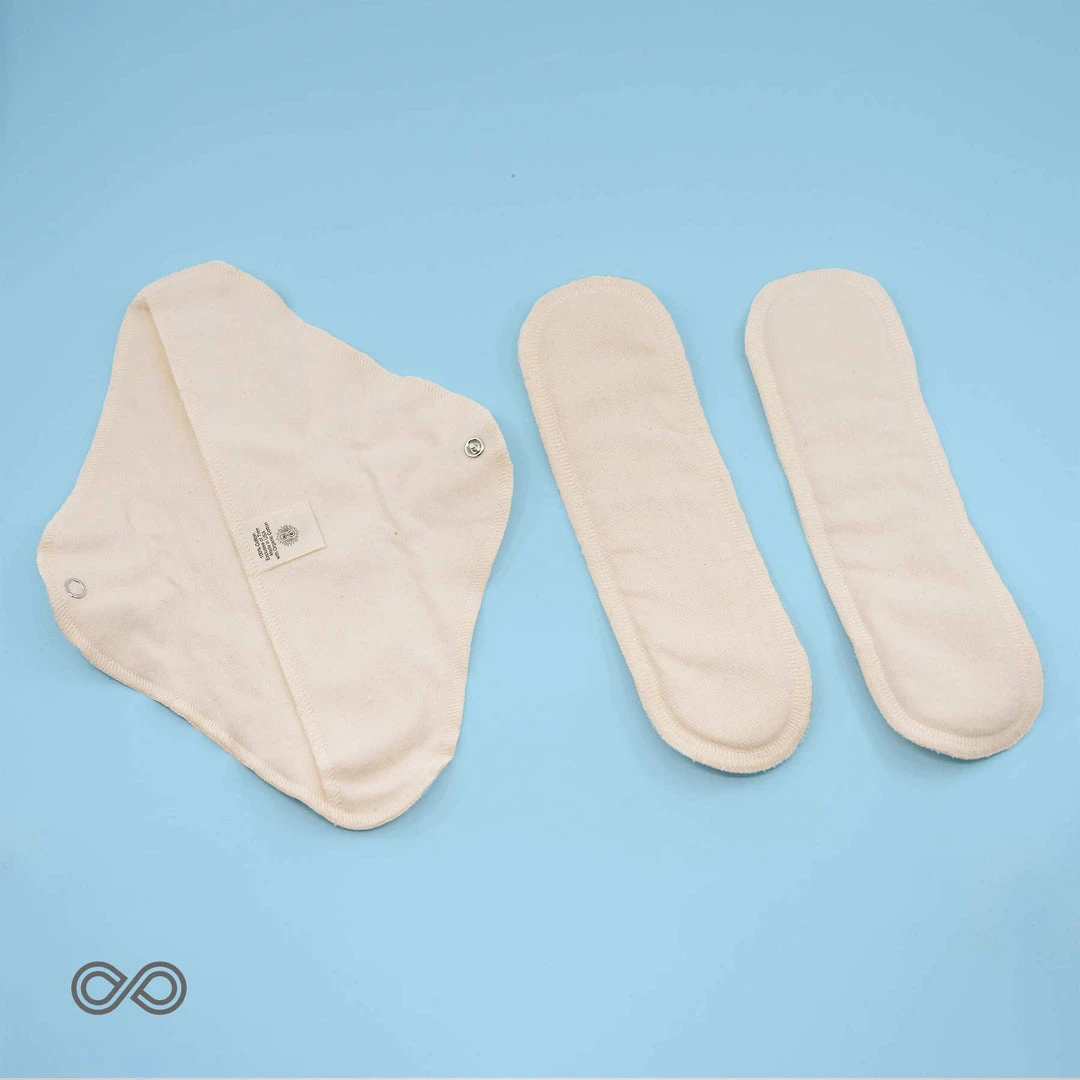 Washable organic cotton pads are the purest, safest, most environmental, sustainable, and perfect way to deal with menstruation. For one menstruation cycle, we recommend 6-12 daytime plus or regular daytime organic cotton pads.