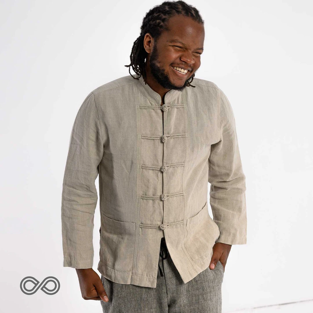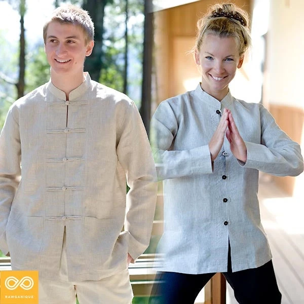 Organic Linen Kung Fu Collar Long-Sleeved Shirt in authentic kung fu styling. The Organic Linen Kung Fu Collar Shirt is made with 100% organically grown European flax linen that is ultra soft, breathable, and smooth.