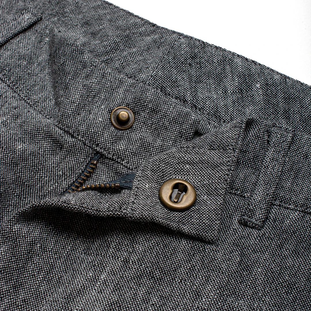 Two roomy side pockets plus two open inside pockets in the back. 5 hemp belt loops. Featuring metal slide-on button in the front. Metal YKK zipper.