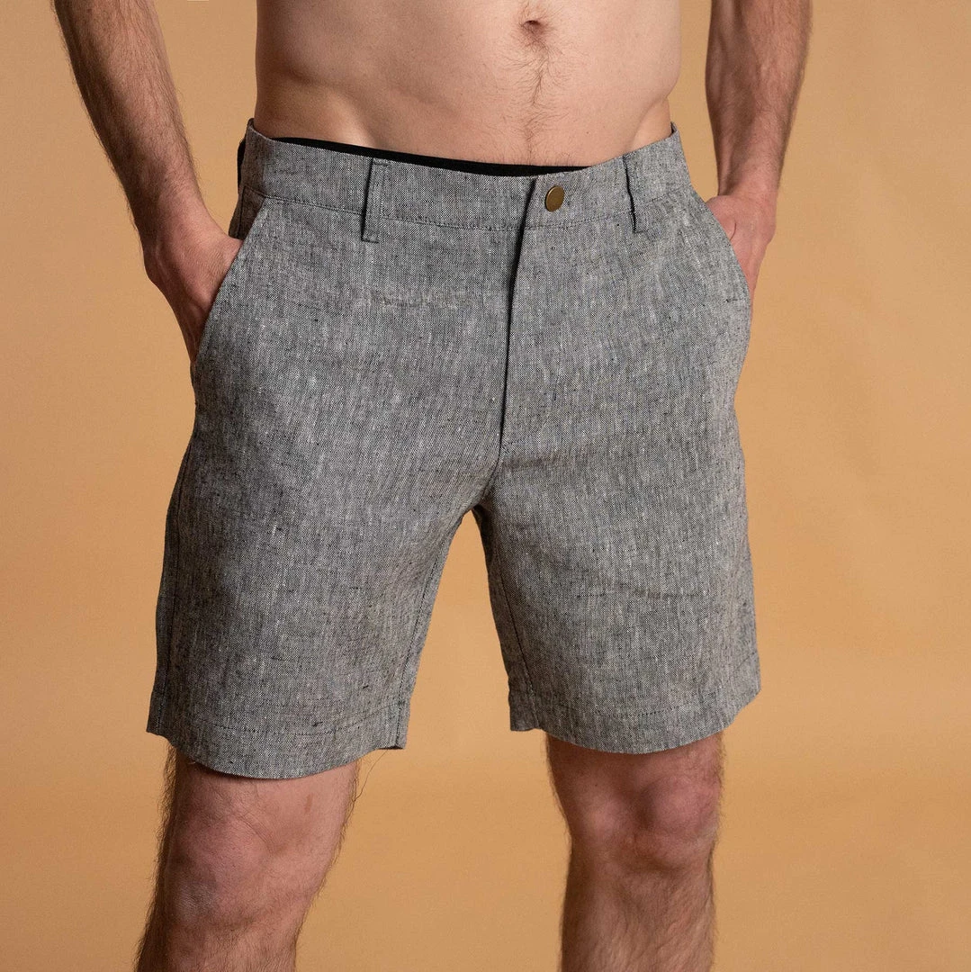 100% organic hemp shorts with slide-out metal buttons (Slide left to open, do not force push to open; button of made of nickel, styled to look like vintage brass). Watch video in Image Gallery for more info. Breathable. Waist sizes 28″ – 38″. Unisex. Elastic-free. 8″ inseam.