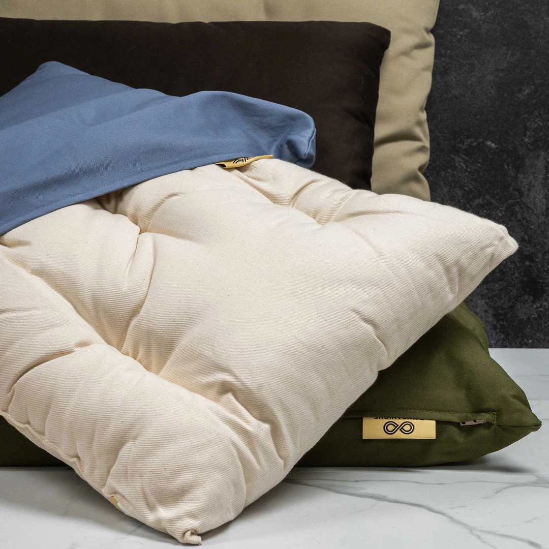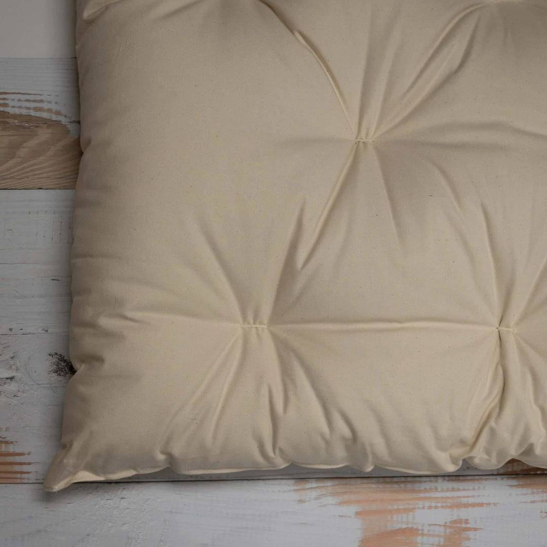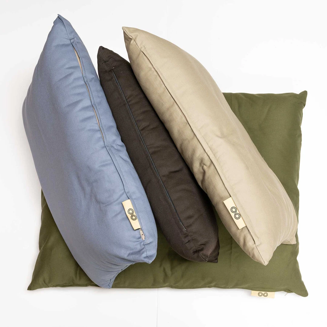 Our Sesame 100% Organic Cotton Pet Bed is named after our raw organic triple-mutt girl shown in the picture. She loves the bed so much, she hogs it all day long. No other dog or cat need apply! The organic pet bed is available as pillow alone (dye-free), or with a strong, also 100% USA organic cotton twill cover in 12 attractive colors as well as dye-free Natural and Black. The fill is 100% certified organic cotton batting – this as well as the fact that it is handmade sweatshop-free in the USA makes this 100% organic pet bed such a rare item.