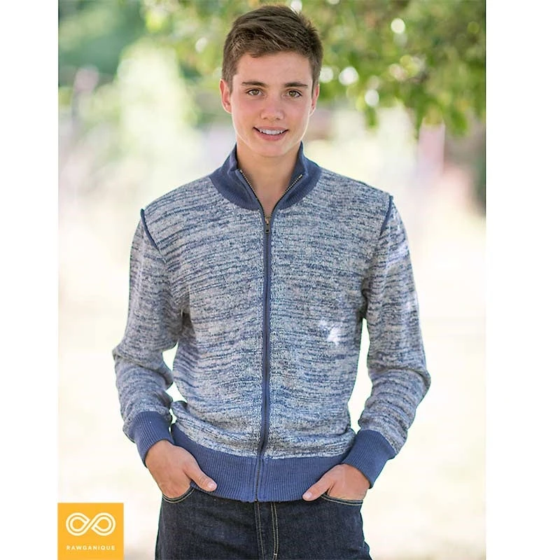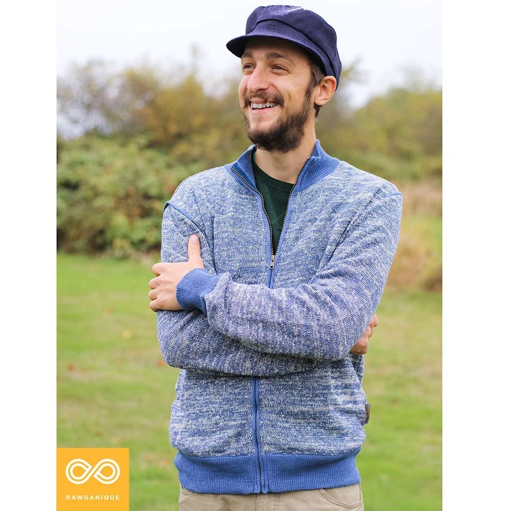 The Union Square Hemp Zip-up Swaeter is made from our famous 100% hemp rainbow knit that is soft and cozy: from variegated hemp yarns in different shades of blue and white.
