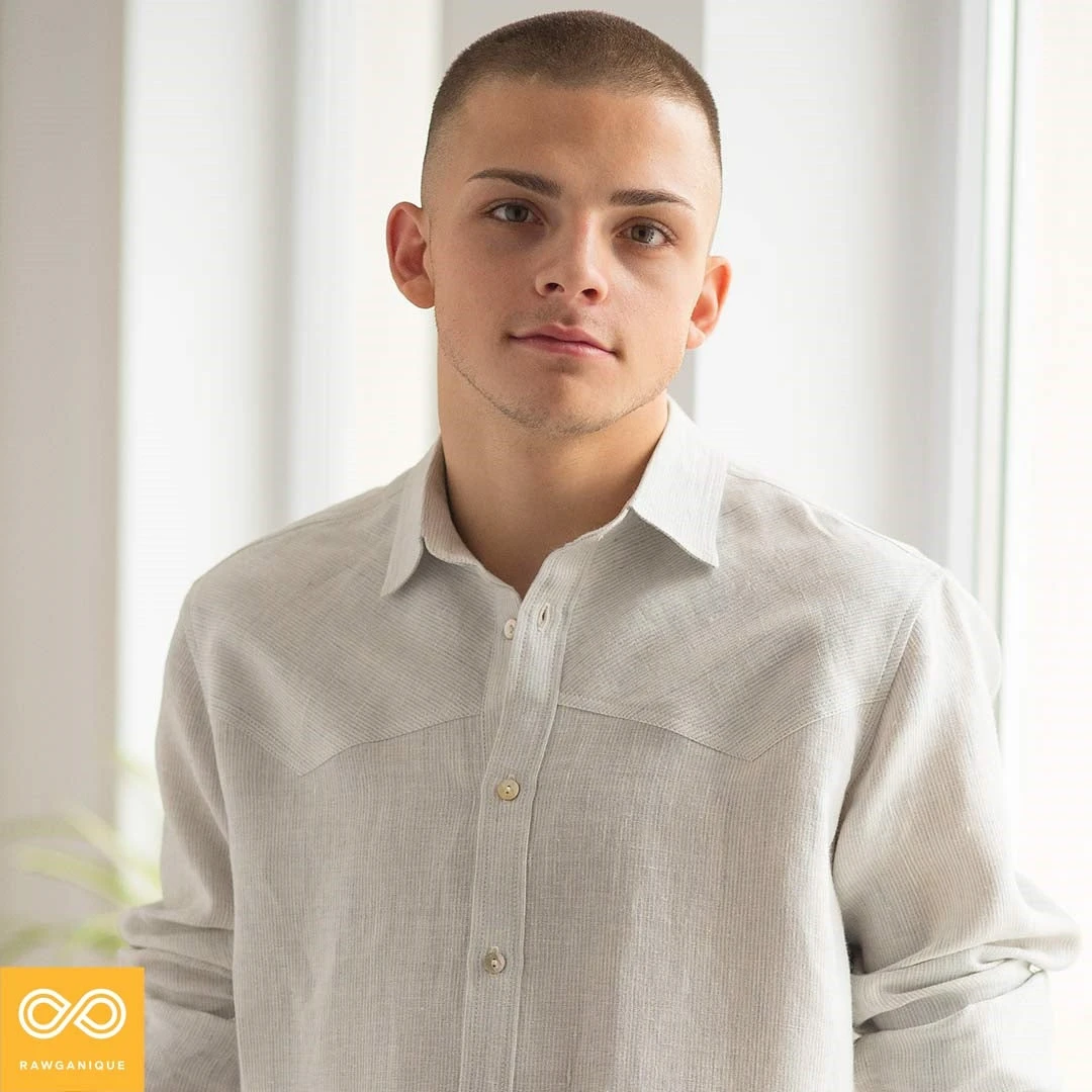 Very fine pinstripe pattern on the finest 100% organic European hemp fabric in the world.